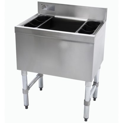 Underbar Basics Cocktail Unit, 16″ deep chest with stainless steel false bottom, 30″W X 18″D X 33″H, 4″ splash, 127-lbs. ice capacity, (2) plastic bottle racks, 22/300 series stainless steel ice bin, front apron & backsplash, 20/430 stainless steel sides, galvanized legs with adjustable bullet feet, NSF