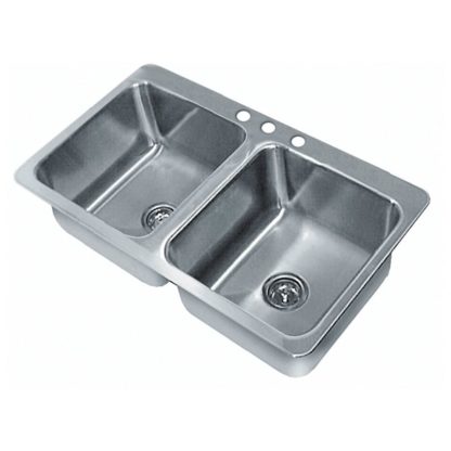 Smart Series Drop-In Sink, 2-compartment, 20″ wide x 16″ front-to-back x 12″ deep each/bowl, 18 gauge 304 series stainless steel, (3) 1-1/4″ holes 4″ o.c., basket drains