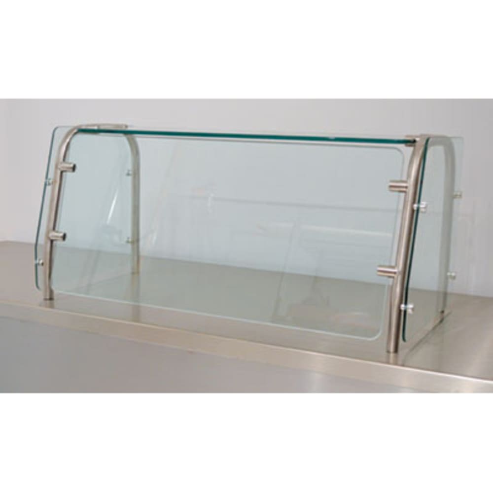 Food shield, cafeteria style with glass top, fixed front glass, 60″ long, 20″ tall, heat tempered glass 3/8″ thick front & 1/4″ thick side panels (side panels 18″ deep to meet NSF requirements), 3/8″ thick heat tempered top glass, 1 stainless steel rounded tubing frame, includes concealed mounting hardware (Note: food shields are also known as sneeze guards or breath shields)