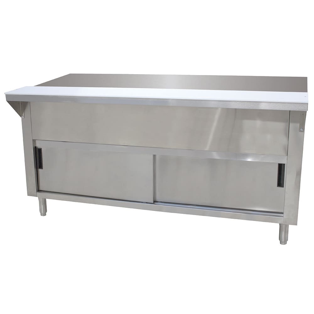 Solid Top Table, 62-7/16″W x 30-5/8″D x 34-3/8″H, 20 gauge 302 stainless steel top with 8″D x 3/8″ thick poly cutting board, 20 gauge 430 stainless steel cabinet base with undershelf & sliding doors, adjustable plastic feet, NSF