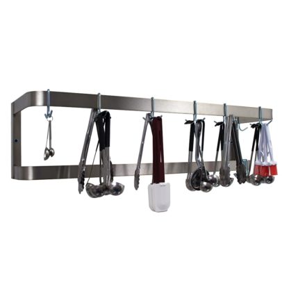 Though the mounting hardware must be purchased separately, the Advance Tabco SW-108 wall-mounted pot rack is designed with welded brackets to facilitate installation. It features two bars and comes with 18 double hooks with which operators can hang selected cookware. Made of stainless steel polished to a satin finish, it can support rigorous use without denting, rusting, or corroding, and overall, this unit measures 108 inches wide by 12 inches deep by 12 inches high.