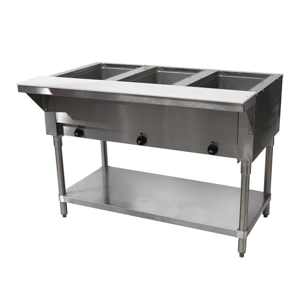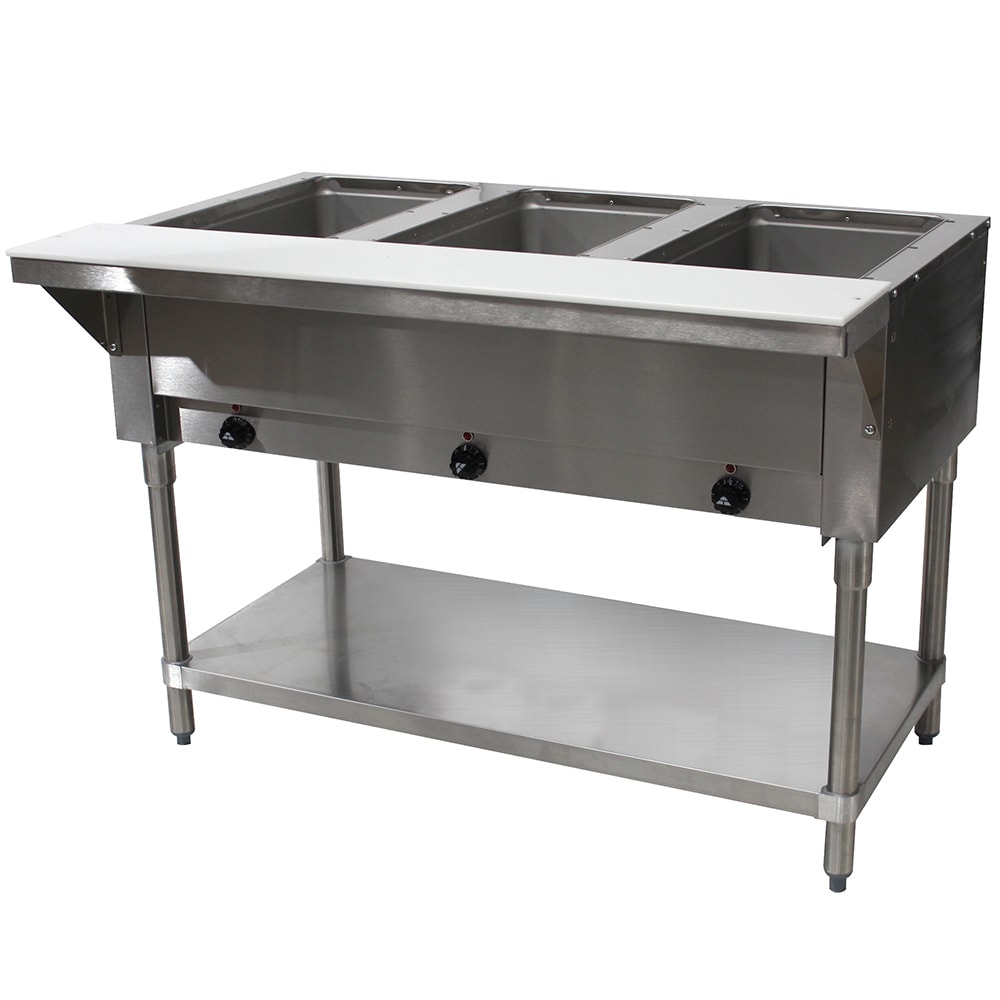 Hot Food Table, electric, 47-1/8″W x 30-5/8″D x 34-1/8″H, (3) 12″ x 20″ sealed wells with individual drain valves (accommodates pan inserts up to 6″ deep), individual infinite controls with indicator lights, 3/8″ thick poly cutting board, stainless steel well liners, galvanized open base with undershelf, UL, NSF (120v)