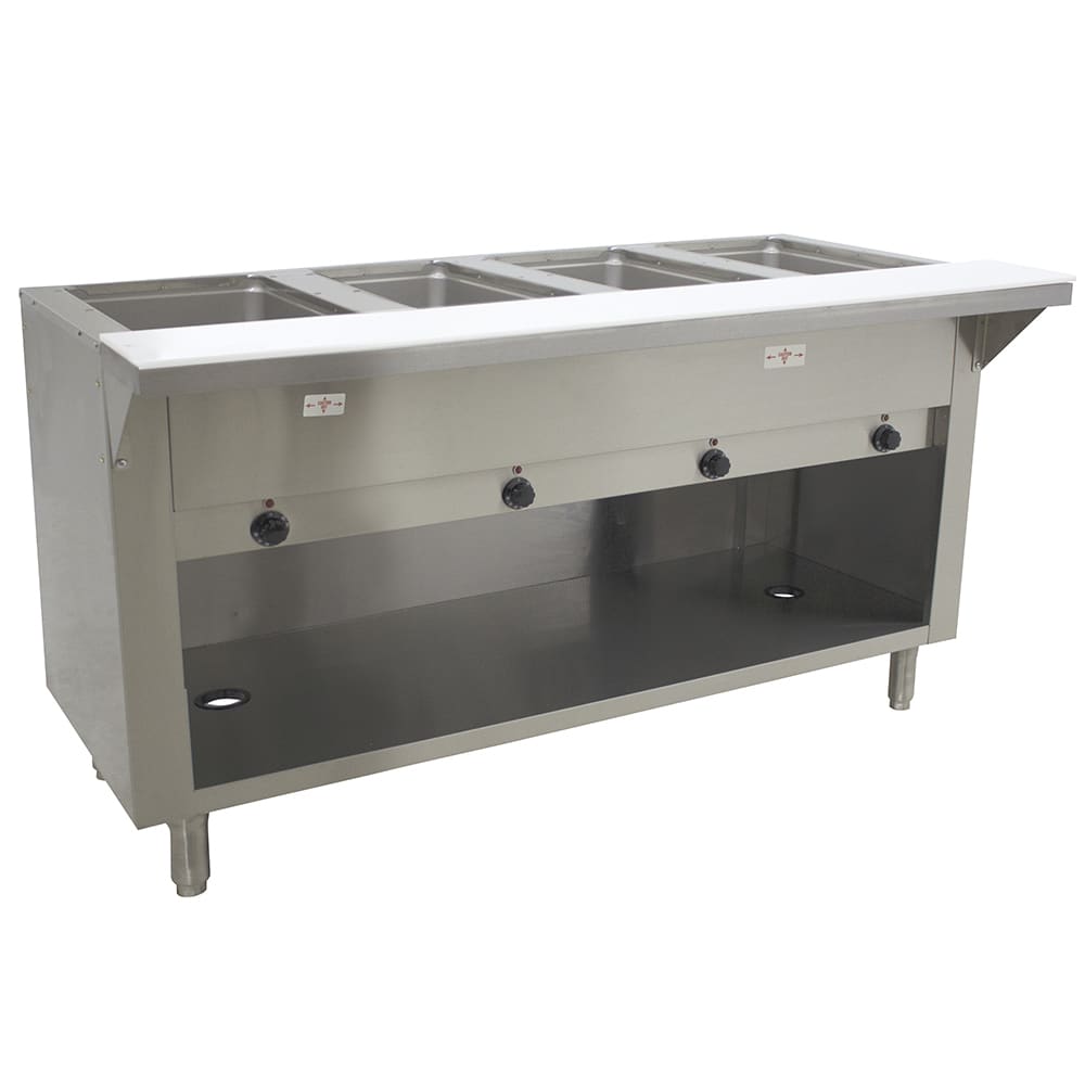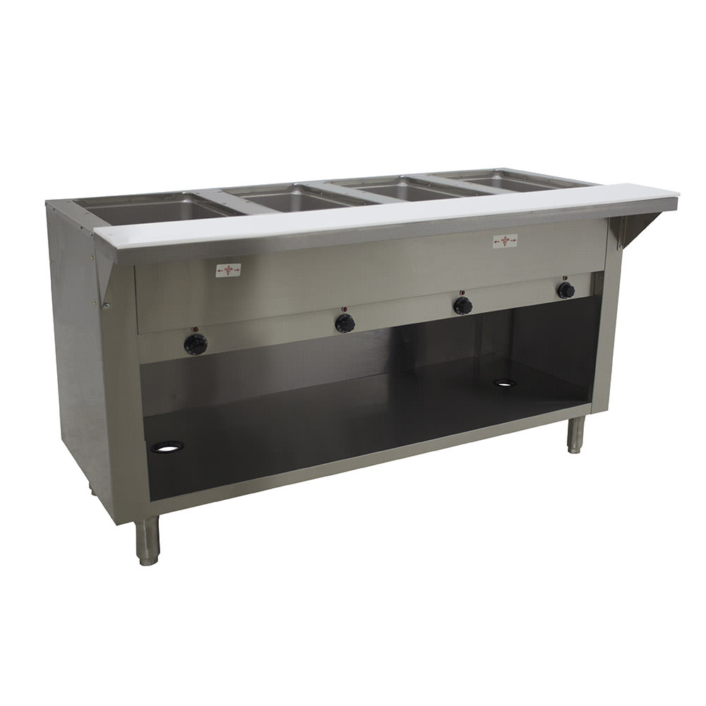 A stainless steel undershelf provides storage space for holding plates or empty food pans, and to ensure pans remain hot, the spaces between the compartments are insulated with fiberglass. Infinite control knobs individually control the wells, and indicator lights notify users when the wells are on. This Advance Tabco SW-4E-120-BS hot food table is not designed to be used for cooking or heating frozen or refrigerated foods.