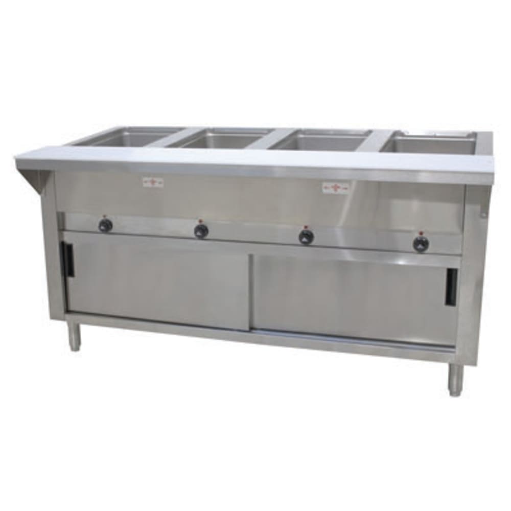 Triumph Hot Food Table, electric, (4) 12″ x 20″ sealed hot food wells with drains, wet or dry operation, 1″ poly cutting board, individual infinite controls, enclosed base with doors, stainless steel construction, 6′ cord, 1PH, 120V