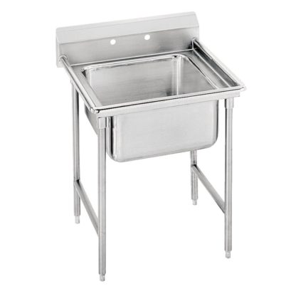 The Advance Tabco T9-1-24 one-compartment sink’s 16-inch by 20-inch bowl has large coved corners that eliminate crevices that could trap and harbor bacteria. Its 12-inch depth is ideal for vegetable and fruit prep or rinsing and soaking dishes before the warewasher. Keeping surrounding areas dry and clean, it has a built-in backsplash that catches splatter. Faucet holes are centered on the backsplash for a faucet, though this component isn’t included with the sink. The unit is made of stainless steel to resist rusting and streamline cleaning.