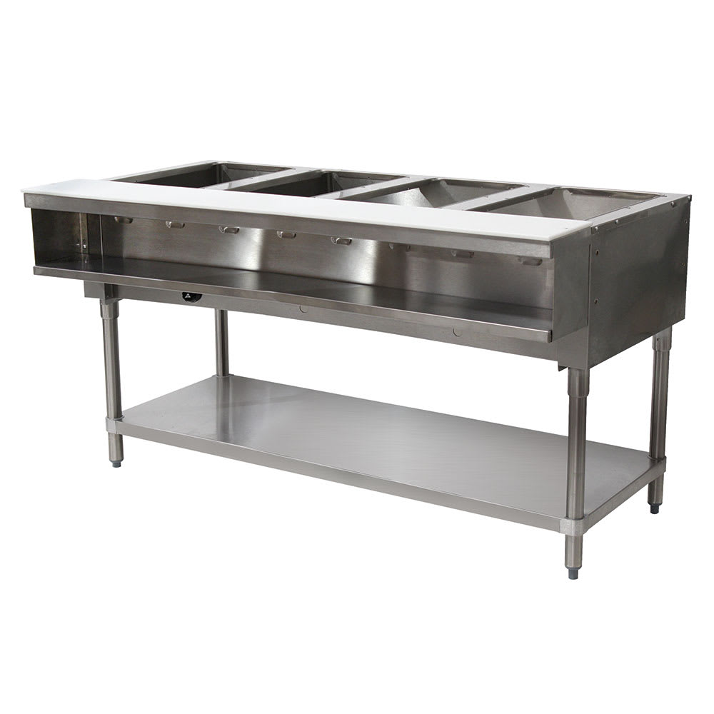 Made of durable stainless steel, the Advance Tabco WB-4G-NAT-X steam table resists rust, dents, and scratches. It is intended to keep prepared foods hot by creating steam. Its four well openings fit (4) 12-inch-by-20-inch food pans with a depth of 73/4-inches. An 8-inch adjustable shelf is secured to the table with die-cast leg clamps, and each leg is inserted into stainless steel gussets with a 1-inch bullet foot for stability. The Advance Tabco WB-4G-NAT-X wetbath hot food table has an 8-inch thermoplastic cutting board that creates space for assembling meals.