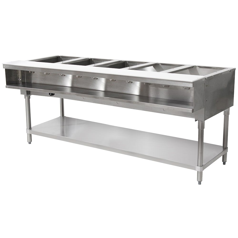 Water Bath Hot Food Table, natural gas, 77-3/4″W x 30-5/8″D x 34-3/8″H, (5) 12″ x 20″ well openings (accommodates pan inserts up to 7-3/4″ deep), stainless steel top, 8″D x 3/8″ thick poly cutting board with stainless plate shelf below, single control knob with (3) settings, pilot indicator, galvanized open base with undershelf, 25,000 BTU, cCSAus, NSF