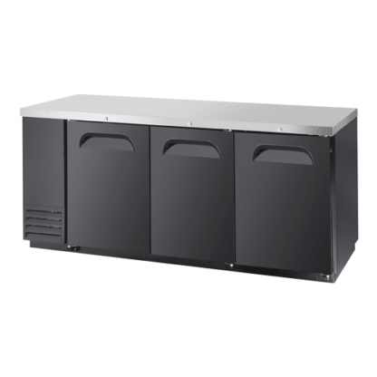 Three-section, 80-79/100″W, side-mounted self-contained refrigeration, stainless steel top, (3) locking solid doors, (6) adjustable shelves, galvanized steel interior with stainless steel floor, black laminated exterior, R290 Hydrocarbon refrigerant, 3/8 HP, 115v/60/1-ph, 3.5 amps, cord with NEMA 5-15P, cETLus, NSF