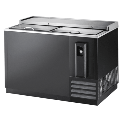 Bottle Cooler, 50″W, side-mounted self-contained refrigeration, stainless steel top, (2) locking sliding lid, removable cap catcher with bottle opener, automatic defrost, galvanized interior with stainless steel floor, black vinyl coated steel exterior, drain, R290 Hydrocarbon refrigerant, 3/8 HP, 115v/60/1-ph, 3.5 amps, cord with NEMA 5-15P, cETLus, ETL-Sanitation