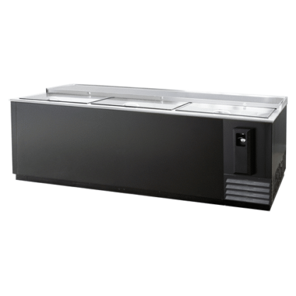Bottle Cooler, 95″W, side-mounted self-contained refrigeration, stainless steel top, (3) locking sliding lid, removable cap catcher with bottle opener, automatic defrost, galvanized interior with stainless steel floor, black vinyl coated steel exterior, drain, R290 Hydrocarbon refrigerant, 3/8 HP, 115v/60/1-ph, 3.5 amps, cord with NEMA 5-15P, cETLus, ETL-Sanitation