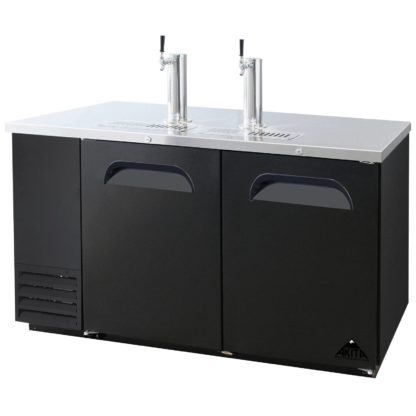 Direct Draw Beer Cooler, two-section, 59″W x 27″D x 37″H, side-mounted self-contained refrigeration, stainless steel top, includes: (2) stainless steel draft towers (1) with single tap, (2) solid doors, (3) keg capacity, analog temperature display, temperature range 32° to 41°F, black vinyl exterior, galvalume interior, R-290 hydrocarbon refrigerant,3/8 HP, 115v/60/1-ph, 3.5amps, cord with NEMA 5-15P, cETLus, NSF