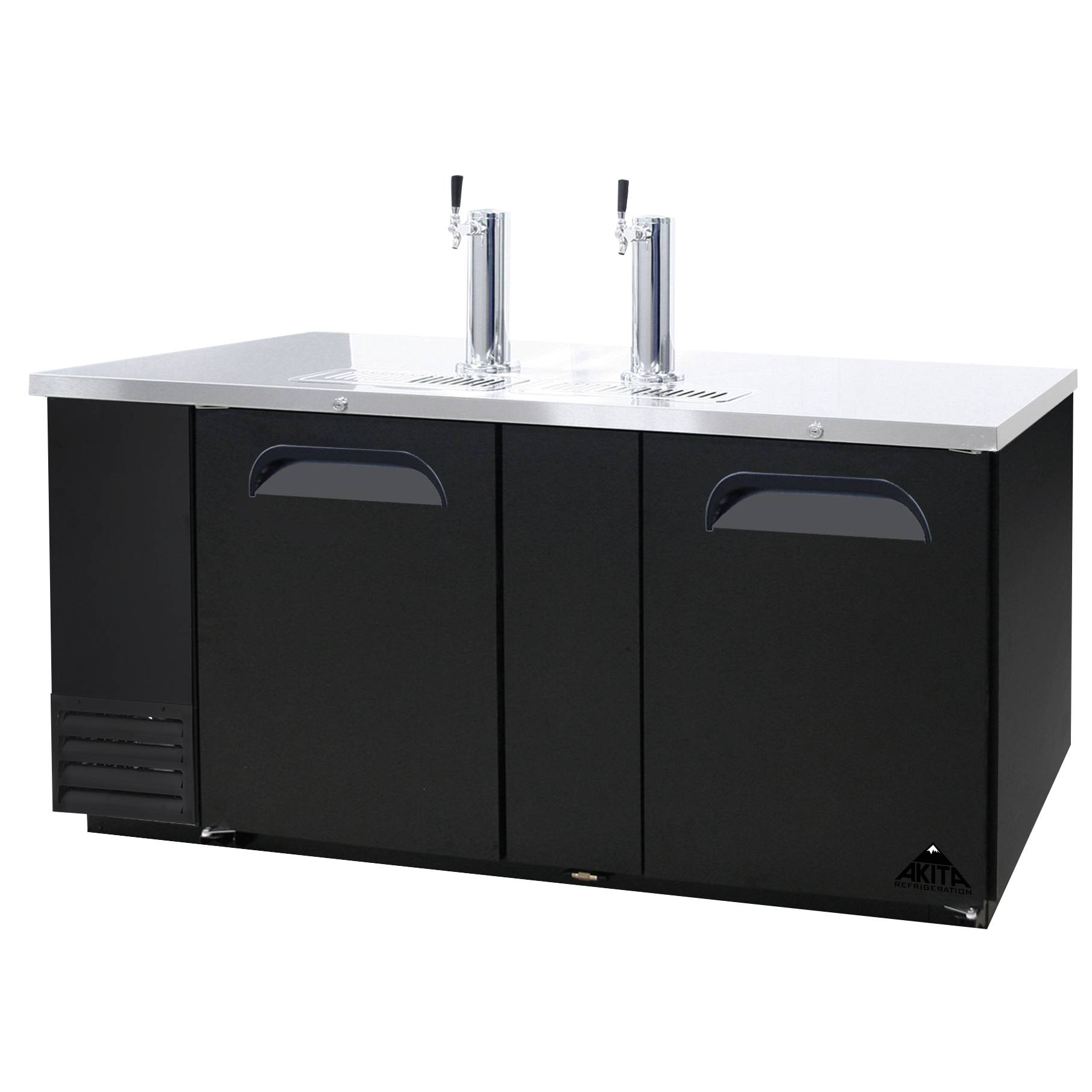 Two-section, 69″W x 27″D x 37″H, side-mounted self-contained refrigeration, stainless steel top, includes: (2) stainless steel draft towers (1) with single tap, (2) solid doors, (3) keg capacity, analog temperature display, temperature range 32° to 41°F, black vinyl exterior, galvalume interior, R-290 hydrocarbon refrigerant,3/8 HP, 115v/60/1-ph, 3.5amps, cord with NEMA 5-15P, cETLus, NSF