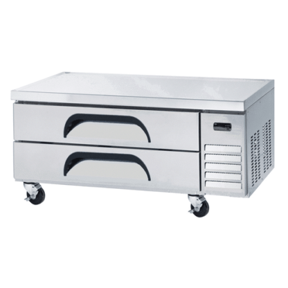 Refrigerated Chef Base Equipment Stand, 36″W, side-mounted self-contained refrigeration, stainless steel flat top, (2) drawers, digital thermometer, automatic defrost, stainless steel interior, stainless steel front & sides, (4) 4″H swivel casters (2 braked), R290 Hydrocarbon refrigerant, 1/4 HP, 115v/60/1-ph, 3 amps, cord with NEMA 5-15P, cETLus, ETL-Sanitation