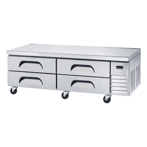 Refrigerated Chef Base Equipment Stand, 74-9/10″W, side-mounted self-contained refrigeration, stainless steel flat top, (4) drawers, digital thermometer, automatic defrost, stainless steel interior, stainless steel front & sides, (4) 4″H swivel casters (2 braked), R290 Hydrocarbon refrigerant, 1/4 HP, 115v/60/1-ph, 3 amps, cord with NEMA 5-15P, cETLus, ETL-Sanitation