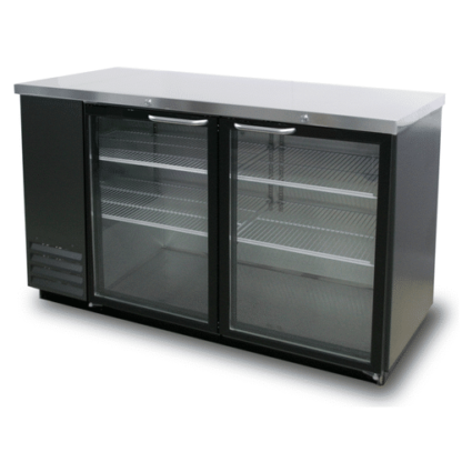Two-section, 59″W, side-mounted self-contained refrigeration, stainless steel top, (2) locking glass doors, (4) adjustable shelves, galvanized steel interior with stainless steel floor, black laminated exterior, R290 Hydrocarbon refrigerant, 3/8 HP, 115v/60/1-ph, 3.5 amps, cord with NEMA 5-15P, cETLus, NSF