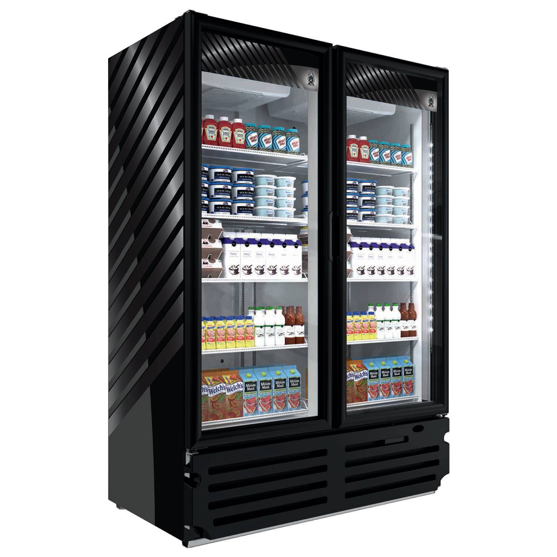 Refrigerated Merchandiser – two-section, 54-1/4″W x 3-3/4″D x 78-3/4″H, self-contained bottom mounted, 37.4 cu. ft. capacity, digital thermostat, 32° to 4.6°F temperature range, automatic defrost, (2) hinged glass doors, LED interior lighting, (10) shelves, white painted steel interior, blsck painted steel exterior, R290 Hydrocarbon refrigerant, 1/2 HP, 115v/60/1-ph, 8.7 amps, cord, NEMA 5-15P, UL, NSF