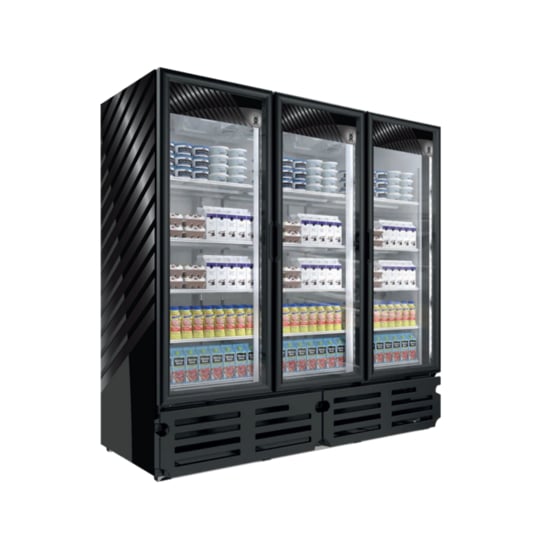Refrigerated Merchandiser, three-section, 78-3/4″W x 33-5/8″D x 79-3/8″H, self-contained bottom mounted, 66.3 cu. ft. capacity, digital thermostat, 32° to 4.6°F temperature range, automatic defrost, (3) hinged glass doors, LED interior lighting, (15) shelves, white painted steel interior, blsck painted steel exterior, R290 Hydrocarbon refrigerant, (2) x 1/2 HP, 115v/60/1-ph, 13.6 amps, cord, NEMA 5-15P, UL, NSF