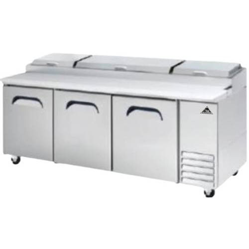 Pizza Prep Unit, three-section, 30.8 cu. ft., side mounted self-contained refrigeration, self closing stainless steel door, (6) adjustable shelves, (12) 1/3 size pan capacity, thermostat temperature control, stainless steel exterior, (6) casters, R290 Hydrocarbon refrigerant, 115v/60/1, NEMA 5-15P, cETLus