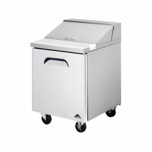 Mega Top Salad / Sandwich Prep Table, one-section, 27-1/2″W, 6.55 cu .ft. interior capacity, rear mount self-contained refrigeration, accommodates (9) 1/6 GN pans & (3) 1/9 G/N pans, 32°F to 41°F temperature range, digital thermostat, auto defrost, (1) self-closing swing door with recessed handle, cutting board, casters, R290 Hydrocarbon refrigerant, 3/8 HP, 115v/60/1-ph, NEMA 5-15P, cETLus, NSF