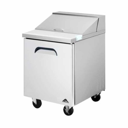 Mega Top Salad / Sandwich Prep Table, one-section, 27-1/2″W, 6.55 cu .ft. interior capacity, rear mount self-contained refrigeration, accommodates (9) 1/6 GN pans & (3) 1/9 G/N pans, 32°F to 41°F temperature range, digital thermostat, auto defrost, (1) self-closing swing door with recessed handle, cutting board, casters, R290 Hydrocarbon refrigerant, 3/8 HP, 115v/60/1-ph, NEMA 5-15P, cETLus, NSF