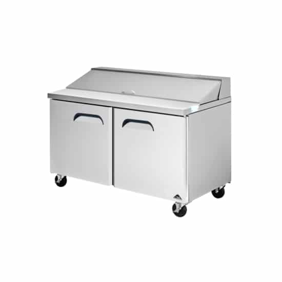Mega Top Salad / Sandwich Prep Table, two-section, 60-35/100″W, 15.56 cu .ft. interior capacity, rear mount self-contained refrigeration, accommodates (24) 1/6 GN pans, 32°F to 41°F temperature range, digital thermostat, auto defrost, (2) self-closing swing doors with recessed handles, (2) shelves, cutting board, casters, R290 Hydrocarbon refrigerant, 3/8 HP, 115v/60/1-ph, cord, NEMA 5-15P, cETLus, NSF