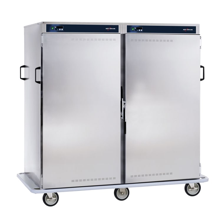 This Alto-Shaam 1000-BQ2/192 meal delivery cart can hold trays, covered plates, or plate carriers depending on what is on hand. Its doors are solid to retain heat and, for durability, the unit is constructed of stainless steel. It resists scarring, rusting, and denting, featuring a full-perimeter bumper around the bottom. This bumper absorbs the force of impacts and is designed to prevent wall markings.