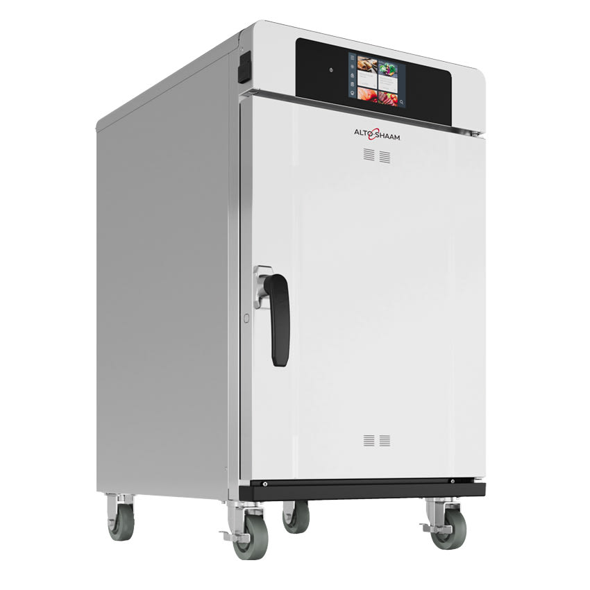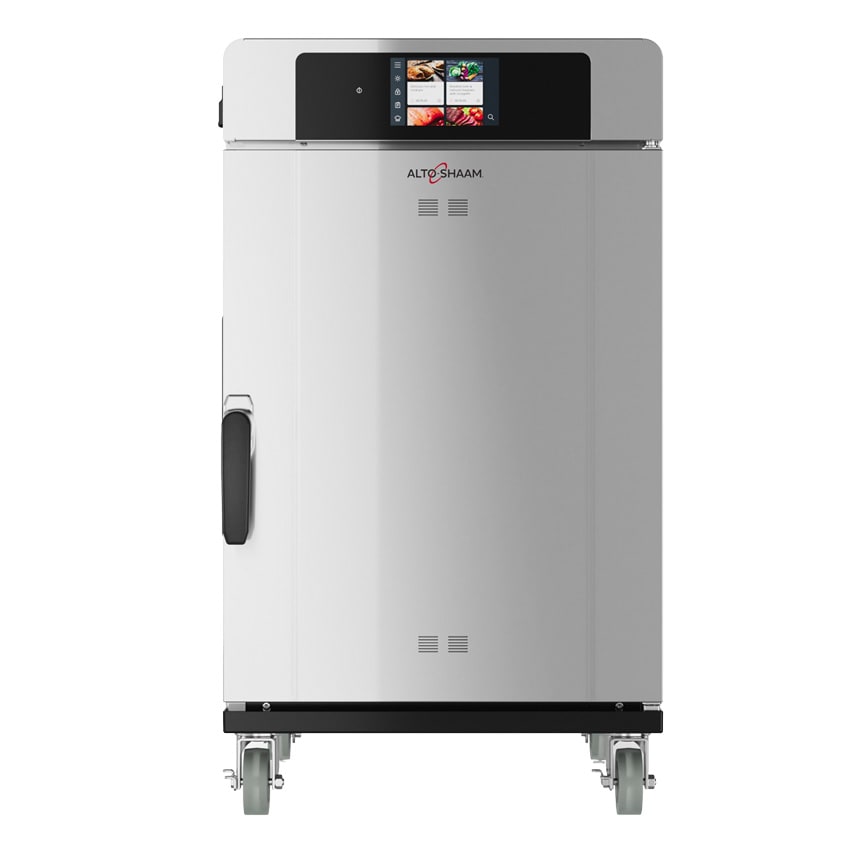 Ideal for cooking and holding large batches of product, the Alto-Shaam 1000-TH-DLX cook-and-hold oven’s three wire shelves support as many as eight full-size pans or 16 half-size pans. The two stainless steel side racks spaced on 17/16-inch centers can offer 15 pan positions. This unit’s reach-in configuration streamlines pan loading and retrieval, and to prevent temperature fluctuations, the SureTemp heat recovery mechanism compensates for heat loss when the door is open. If the door is open for longer than 3 minutes, an audible alarm alerts the operator. This half-height, stainless steel unit is fitted with four 31/2-inch casters-two are rigid and the others swivel and brake.