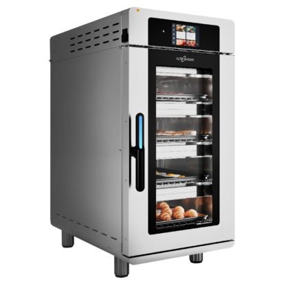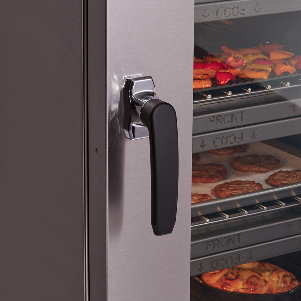 Holding four half-size sheet pans or four full-size hotel pans, the Alto-Shaam VMC-H4H cook-and-hold oven has one wire rack and two jet plates per chamber. Made of stainless steel, this unit is durable enough for high-volume use, and to check on food while it cooks, the door includes a glass window so the chef can see inside. This saves money on energy and keeps heat trapped inside because the door doesn’t have to be opened constantly.