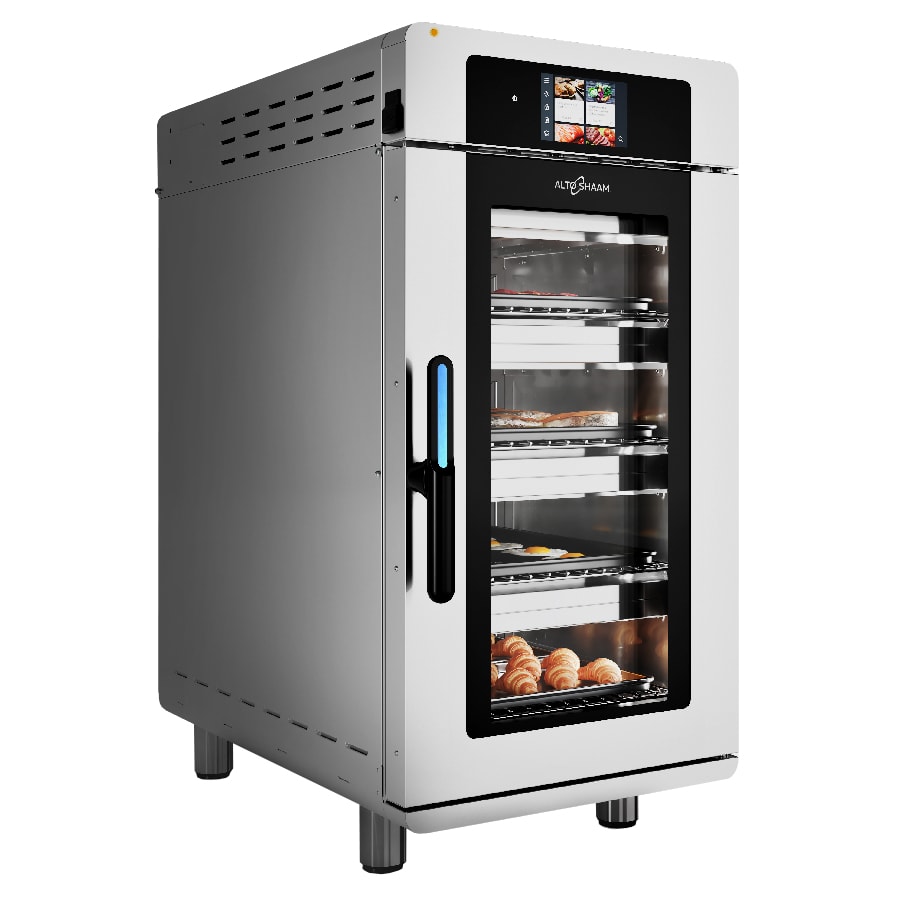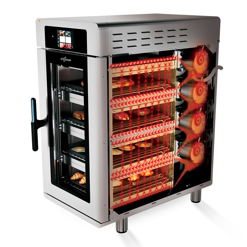 The Alto-Shaam VMC-H4H half-size Vector cook-and-hold oven cooks food quickly using Structured Air Technology, and because the four chambers have individual controls, this unit can cook multiple types of food at once without interfering with the others. Users can program the temperature, timer, and fan speed with the touchscreen display. To further increase ease of use, recipes can be uploaded using an included USB port.