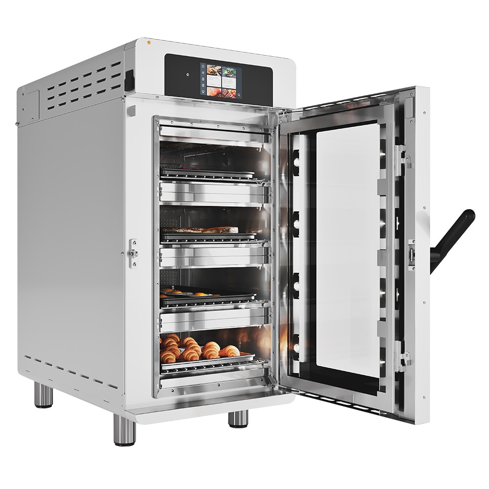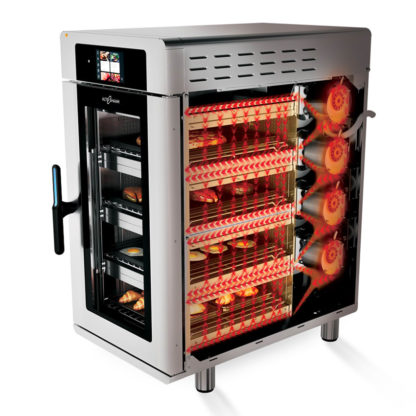 Vector H Series Multi-Cook Oven, electric, (4) individually controlled cooking chambers, holds (4) half-size sheet pans or (4) full-size hotel pans, programmable touch screen controls with Structured Air Technology, double pane glass door, ventless catalytic converter, includes: (1) wire rack & (2) jet plates per cooking chamber, USB port, stainless steel construction, 4″ adjustable legs, cULus, UL EPH Classified, Made in USA