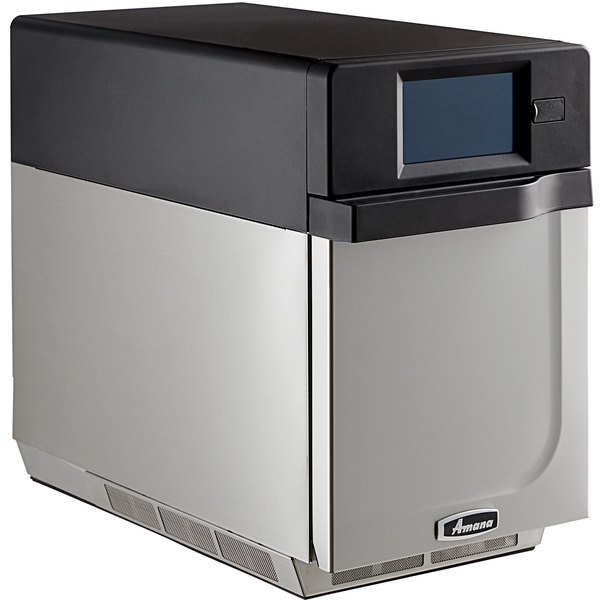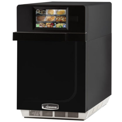 This Amana rapid cook oven features a sleek, contemporary black exterior making it perfect for front-of-house use. Designed with safety and simplicity in mind, this rapid cook oven is a reliable addition to your establishment. An inner door drops down below the cooking surface to allow for the safe removal of food from the cavity. The rapid cool down setting also helps expedite the cleaning process at the end of the day. With a smooth door surface for easy cleaning and preinstalled non-stick oven liners, this unit comes ready to use for added convenience. It boasts 3000W of impingement power, 1000W of microwave power, and requires a 208/240V electrical connection for operation.