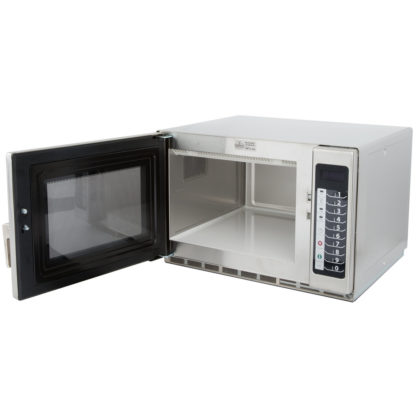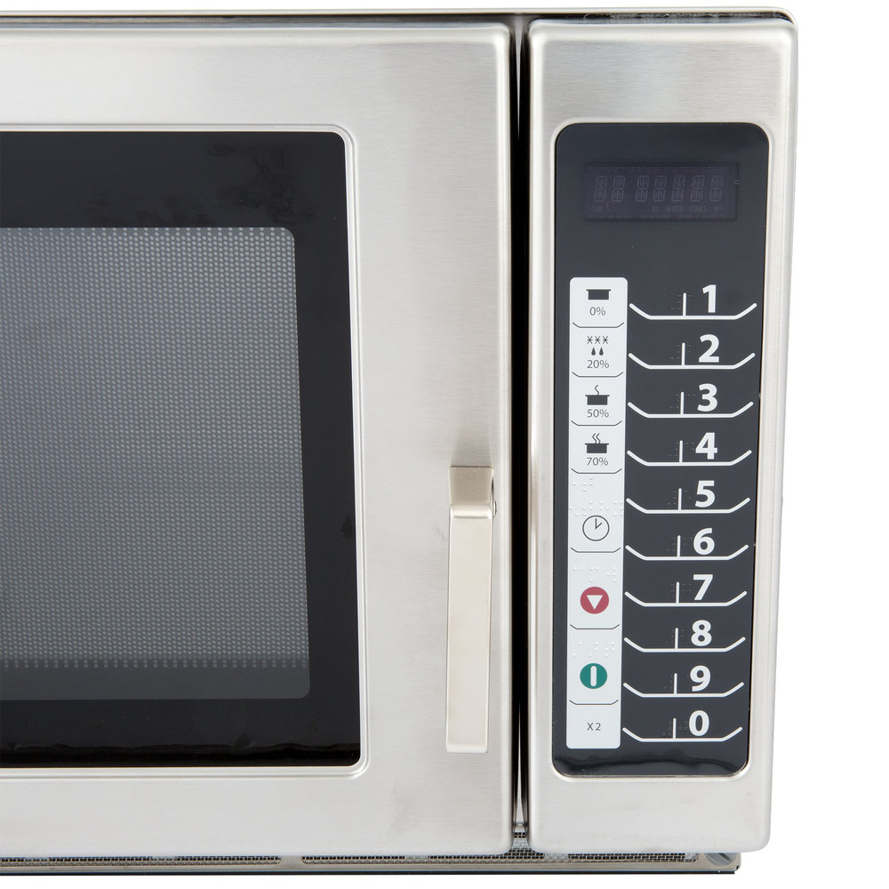 This commercial microwave features a 1.2 cubic foot capacity, while the stainless steel exterior and interior with a sealed ceramic shelf and removable splatter shield enable easy cleanup. For simple and efficient operation, this unit features a unique ergonomic door handle that can be opened with one finger even when your hands are full! Meanwhile for simple maintenance, a removable air filter protects the oven components from grease-laden air, prolonging the unit’s life, and a clean filter reminder even tells you when it’s time to be cleaned! The braille-integrated touch pad controls include an X2 quantity pad allows you to set double-quantity cook time with just the press of a button, while the “on the fly” cooking feature lets you reset the timer without terminating the current cooking cycle.