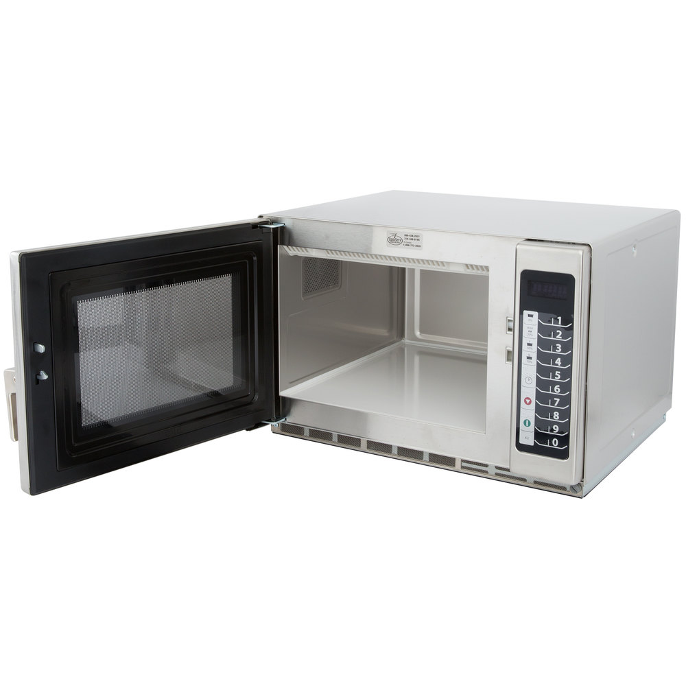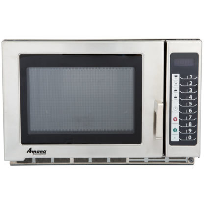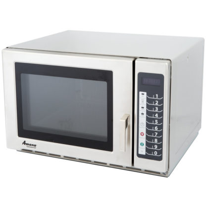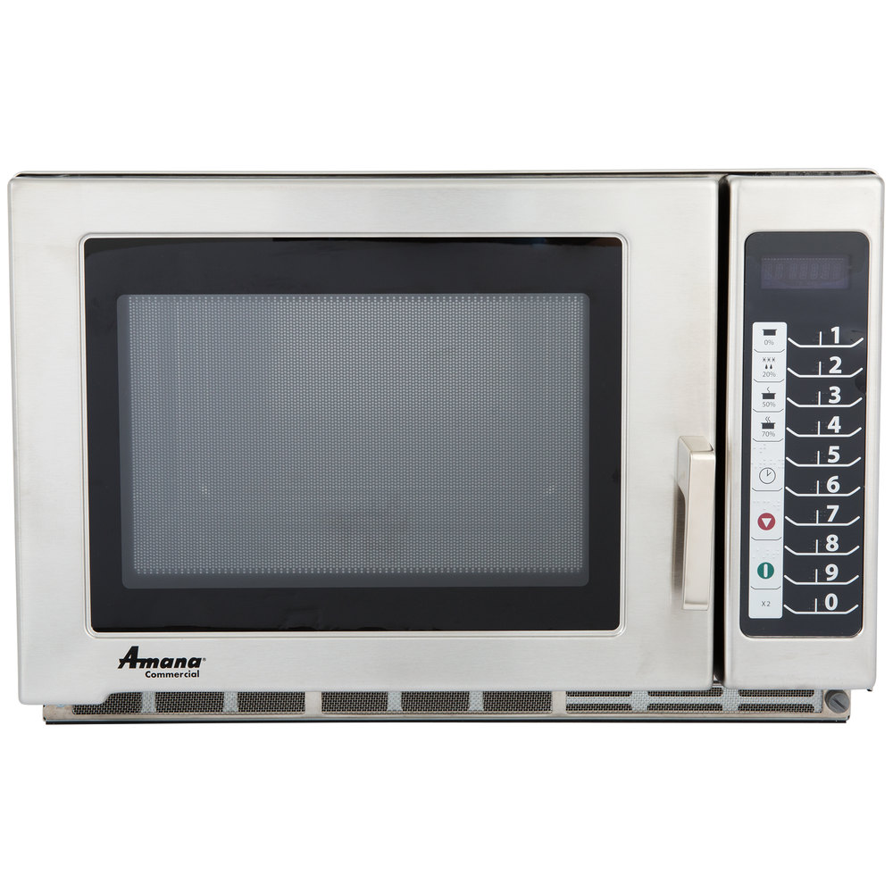 The powerful 1800W Amana RFS18TS commercial microwave oven is packed with features to meet the needs of medium-duty food service operations, from fast casual and family restaurants to bars, grills, and schools! Five power levels plus the ability to program up to 100 different menu items combine with 2 magnetrons that each have a rotating antenna for even heating throughout the cavity to ensure that you enjoy even cooking and consistent food quality every time. This unit is also stackable, so you can add multiple units without sacrificing valuable countertop space.