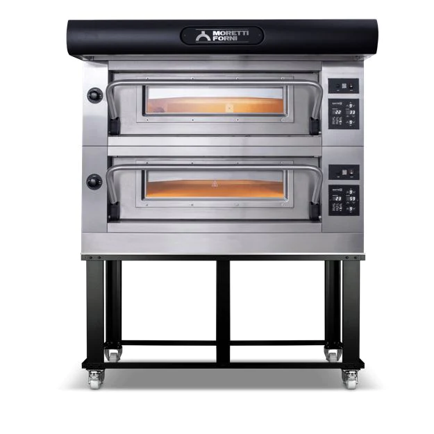 Moretti Forni Pizza Oven, deck-type, electric, (2) 26″W x 41″D x 7″H decks, (12) 12″ or (4) 18″ pizza capacity, (20) customizable programs (per deck), 840°F max operating temperature, timer, (2) stainless steel bottom-hinged doors, halogen lighting, refractory brick baking chamber (entire camera), stainless steel construction, 15.4kW, CE, ETL, ETL-Sanitation, Made in Italy