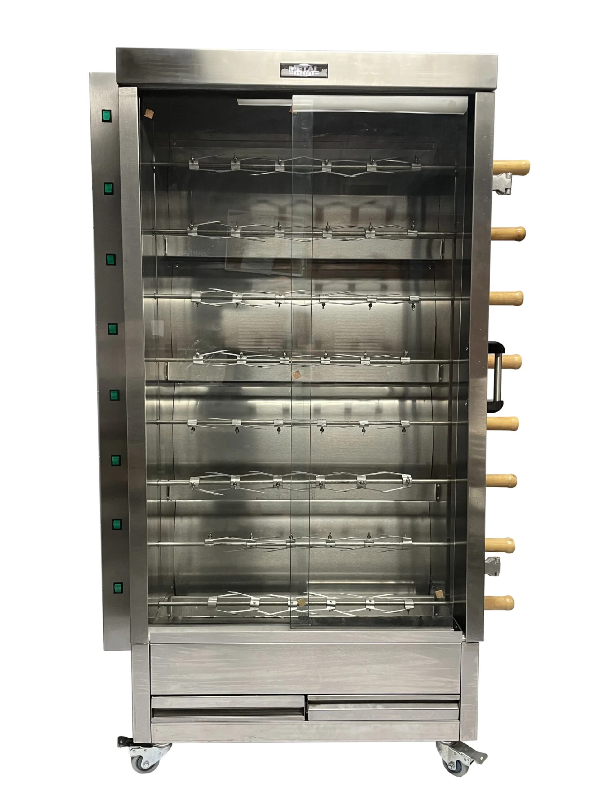 Metal Supreme Rotisserie Oven, liquid propane gas, (8) Stainless steel V spit skewers, (40) chicken capacity, 40 chickens/hr average productivity, tempered-glass sliding doors, stainless steel front, sides & interior cavity, (2) stainless steel grease drawers, 3” casters, 120,000 BTU, 110v/60/1-ph, 4.8 amps