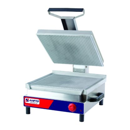 Heavy Duty Stainless steel body with Cast aluminum ribbed grid plate. It has an adjustable temperature control for uniform heating. Easy to use and clean. Ideal for gourmet sandwiches, grilled burgers, fish, chicken, and more. Uses Plug 5-15P.