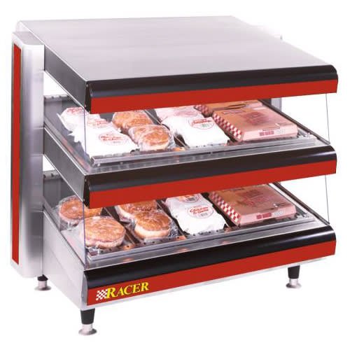 Racer Slanted Open Air Heated Merchandiser, countertop, 30″, (2) shelves, thermostatically controlled, tempered glass end panels, incandescent lights, aluminum & stainless steel base, sides, & top, 4″ polycarbonate & steel legs, cULus, UL