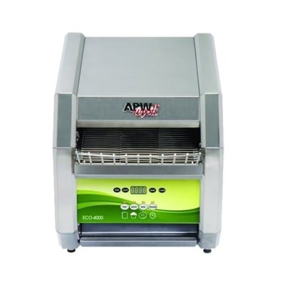 The APW ECO 4000-350E conveyor toaster has a stainless steel housing that provides durability and rust resistance. It has a high-limit switch that prevents the unit from overheating, and an energy-saver timer reduces energy use when business is slow. For product removal, the self-dispensing door slides forward. This unit has a 11/2-inch opening to load product, and it toasts 350 slices of bread per hour. To uniformly crisp product, it has quartz heating elements on the top and bottom.