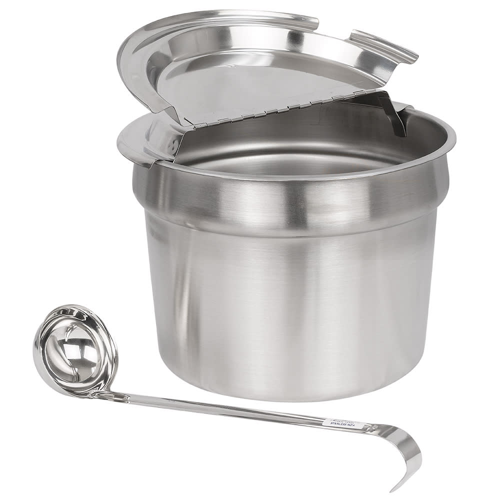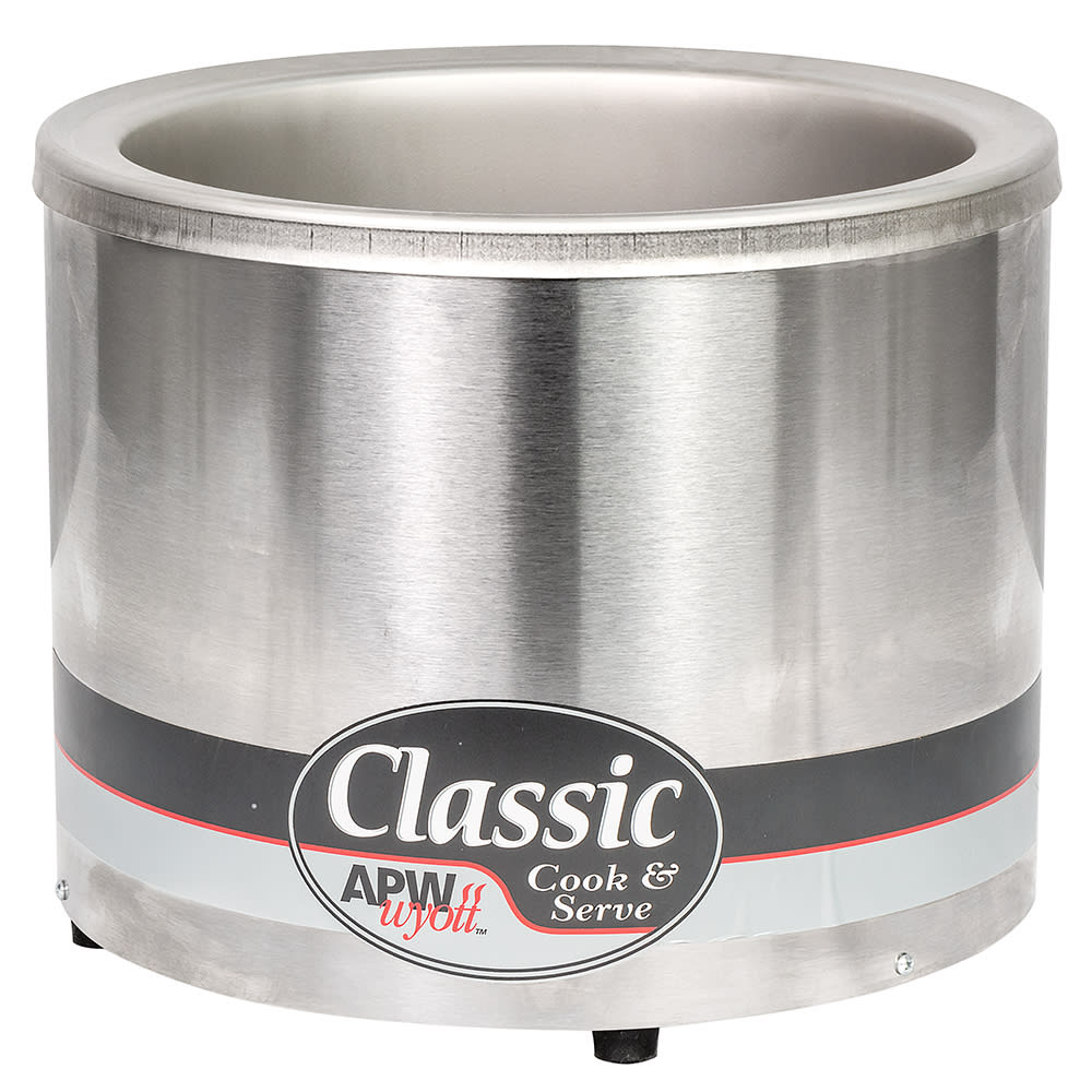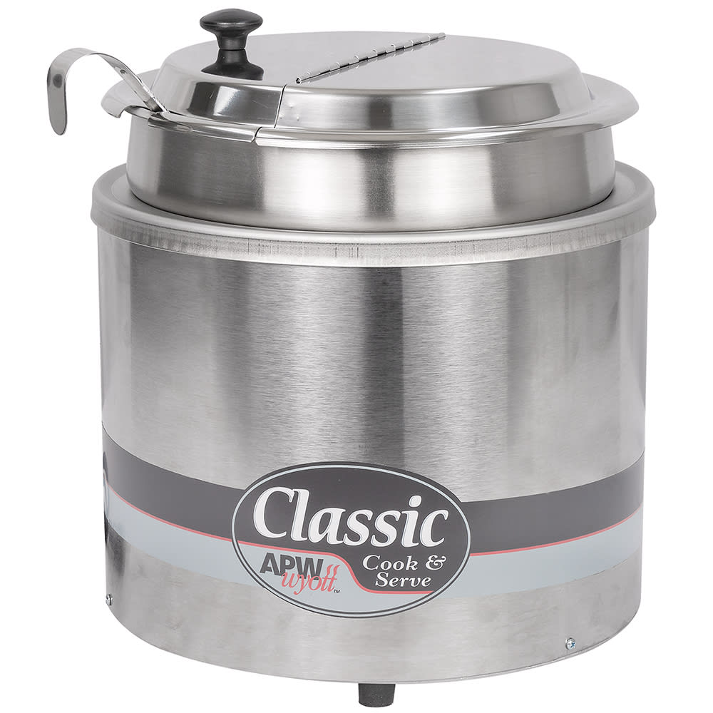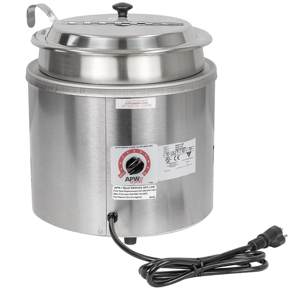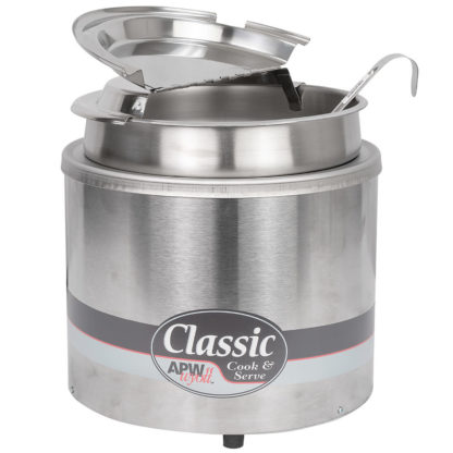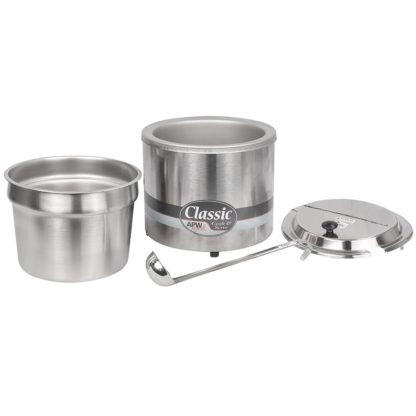 The APW RCW-11SP soup warmer comes with a well, serving ladle, and well cover, making set up and operation simple. The liner is designed with a raised marine edge to avoid the accumulation of condensation, reducing messes. Its compact design fits comfortably on most countertops, and its housing is made of stainless steel for increased durability.