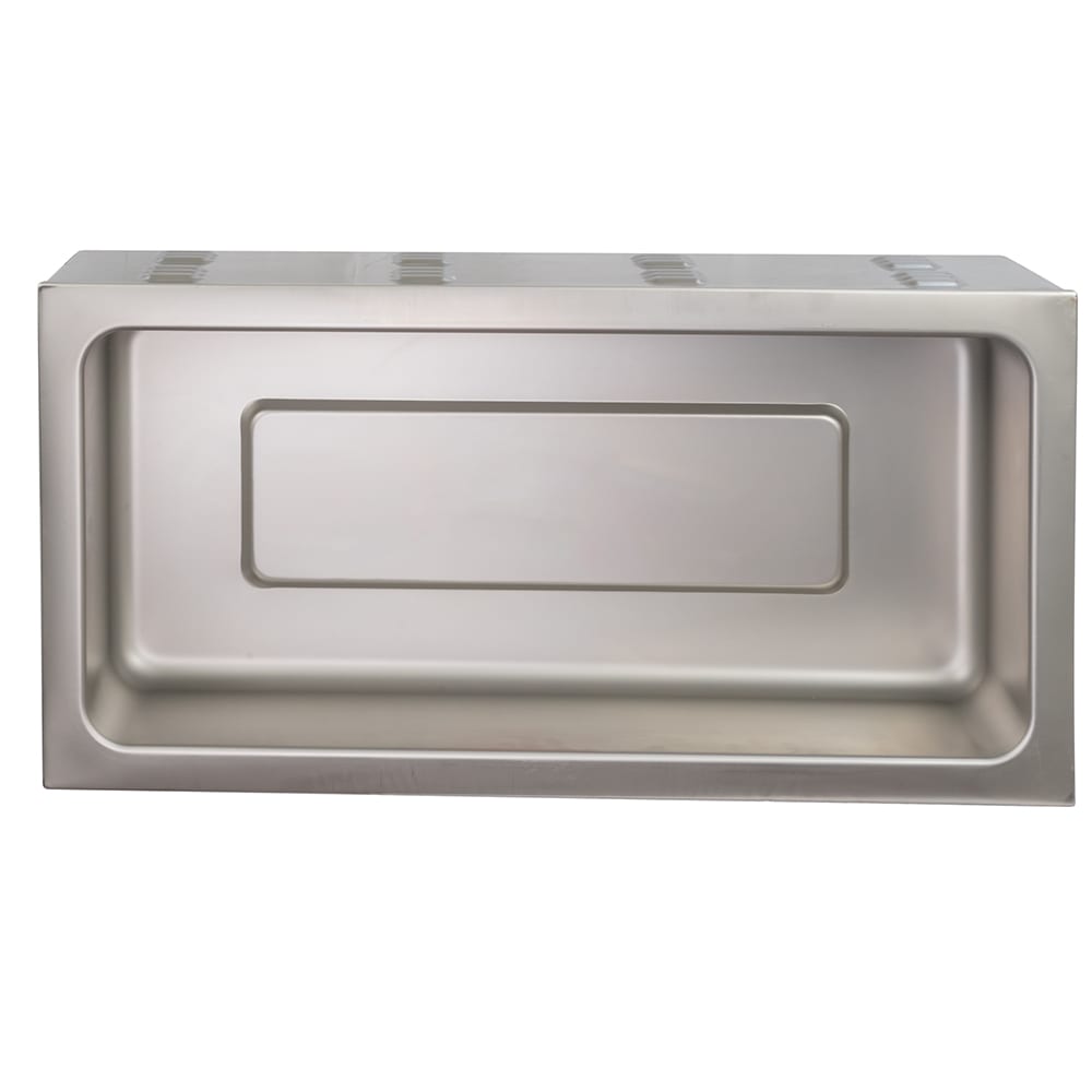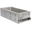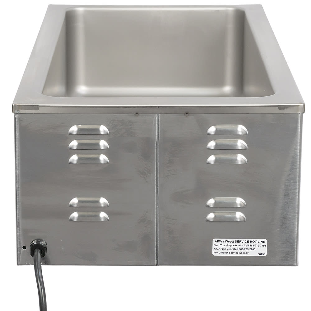 The APW W-43V countertop food warmer is extended length, meaning it can hold more than one full-size pan. This model can hold up to four 1/3-size pans, the fractional equivalents, or even round insets when used with an adapter plate, which is sold separately. Under the food well is a serpentine W-shaped heating element, which is spread out under the food well to help encourage even heat distribution. Also helping encourage this is the steel element support, which helps to hold the element in place and reflect heat back up toward the food pan. This model can be used wet or dry, though it is recommended to use it with water to achieve the most even heat distribution.