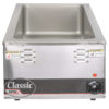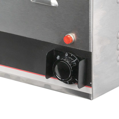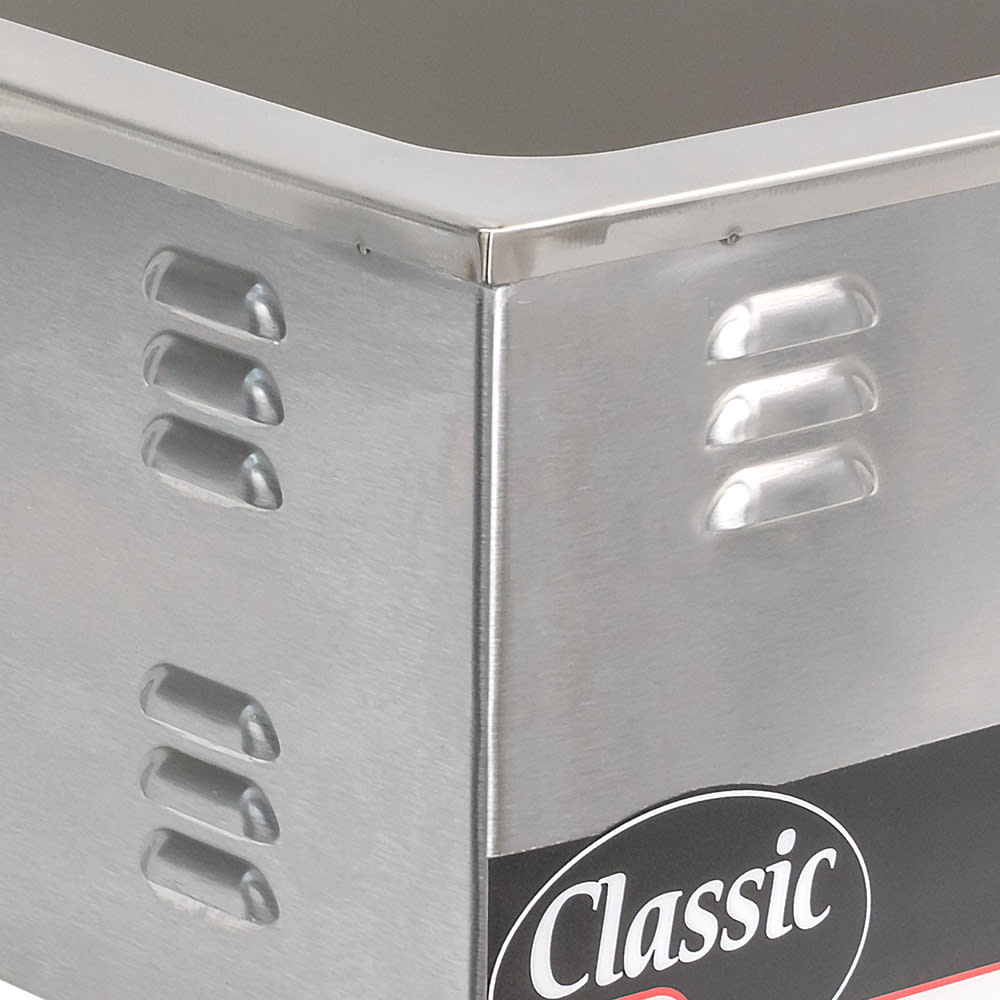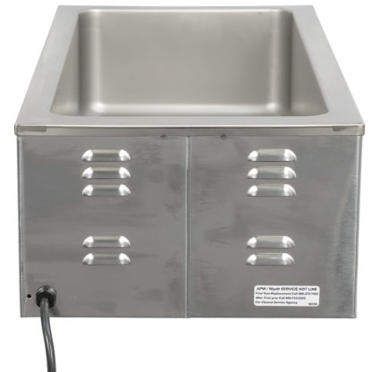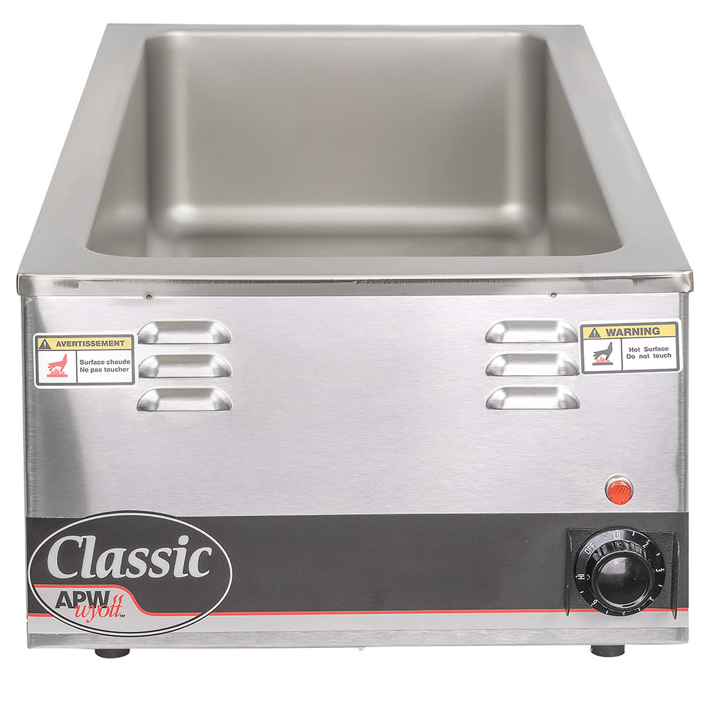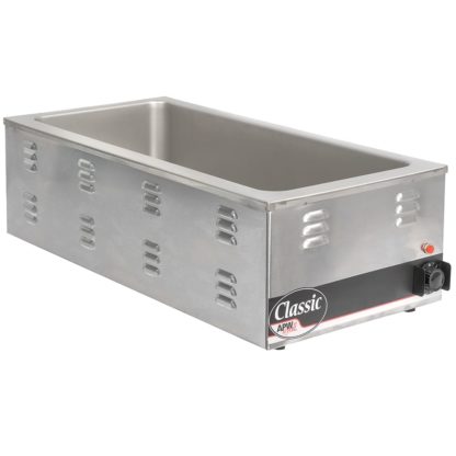 This warmer is made to have a long life, with heavy-duty stainless steel construction and a stainless steel food pan. The warmer’s temperature is set by an infinite control knob, which is protected by a knob guard. Because this model is so durable, it is suitable for use on a buffet or serving line or in back-of-house for holding food at safe serving temperatures until it is ready to be served. The included 60-inch cord with a standard three-prong NEMA 5-15P plug makes installing and moving this unit simple anywhere an electrical outlet is available.