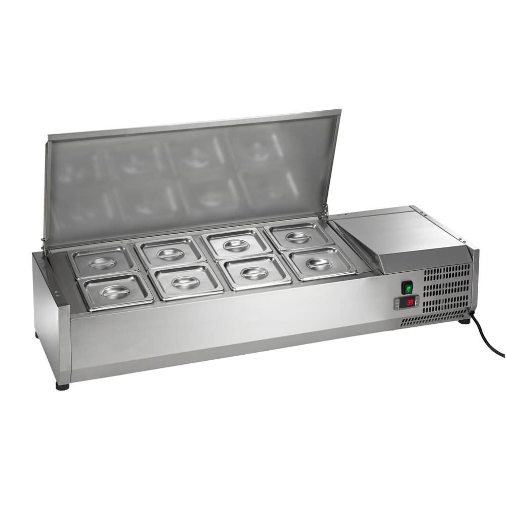 Keep all your essential ingredients and prep items nearby with this Arctic Air ACP48 refrigerated countertop condiment prep station. Perfect for storing items such as sliced tomatoes, pickles, relish, onions, and more, this unit increases the ease of prep work as it ensures the condiments are kept at the appropriate temperature. A total of (8) 1/6 size stainless steel food pans are included, in addition to matching covers and pan support bars.