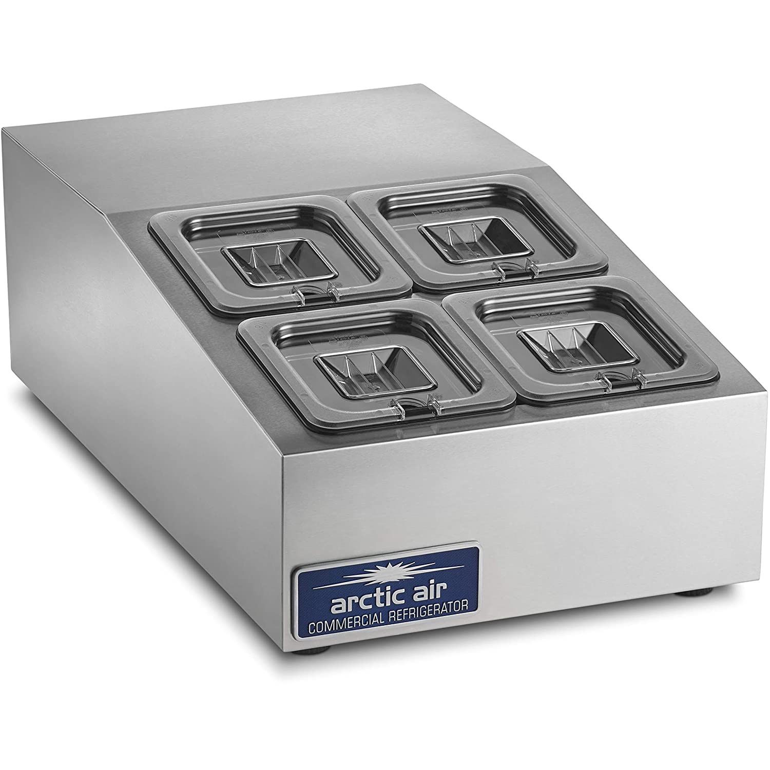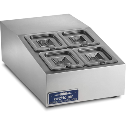 Maximize your sandwich or salad production with this Arctic Air ACP4SQ 15″ countertop refrigerated prep rail! A perfect addition to your preparation area, its angled, raised rail holds four 1/6 size pans up to 6″ deep in the back and 4″ deep in the front. In fact, the pans and covers come included with your purchase, so you can plug the unit in and start using it right away! The compact 15″ width fits easily on prep tables or countertops, providing the operator with additional toppings for subs, salads, or flatbreads.