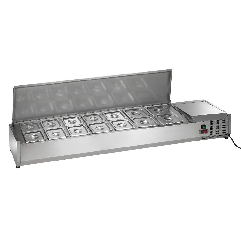 Exterior and interior stainless steel construction ensures long-lasting durability, and a total of four non-scratch plastic feet provide stability and keep it from sliding or leaving marks on your prep table. A self-contained capillary tube refrigeration system uses environmentally friendly R290 refrigerant, providing reliable and even cooling throughout the unit. This unit has an integrated electronic thermostat that allows you to set the temperature between 33 and 41 degrees Fahrenheit, while its external digital LED panel displays the exact temperature for easy monitoring. Additionally, a stainless steel hinged cover attaches to the unit’s top and can be used to add further protection against airborne contaminants.