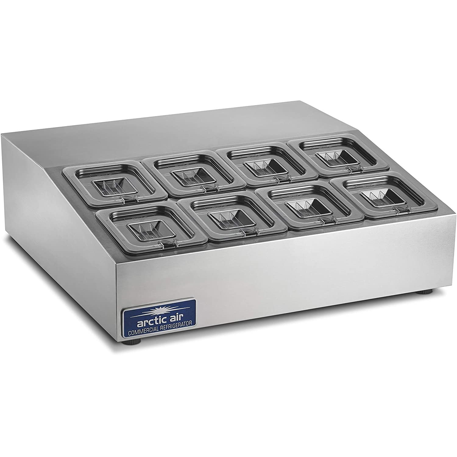 Maximize your sandwich or salad production with this Arctic Air ACP8SQ 28″ countertop refrigerated prep rail! A perfect addition to your preparation area, its angled, raised rail holds eight 1/6 size pans up to 6″ deep in the back and 4″ deep in the front. In fact, the pans and covers come included with your purchase, so you can plug the unit in and start using it right away! The compact 28″ width fits easily on prep tables or countertops, providing the operator with additional toppings for subs, salads, or flatbreads.