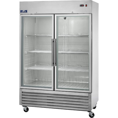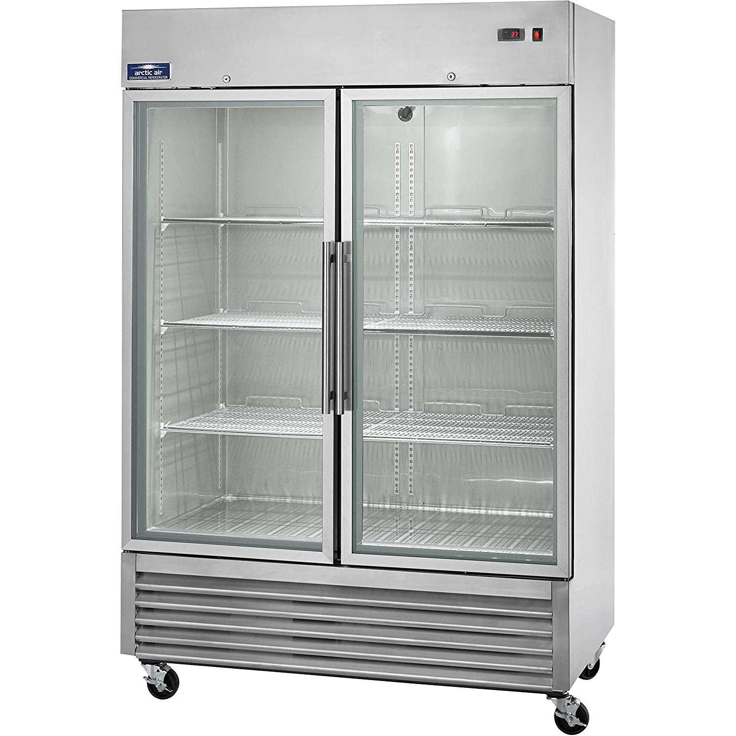 The Arctic Air AGR49 is a two-section commercial reach-in refrigerator unit designed for convenient storage and food safety. Ideal for storing bulk meat or produce in restaurant or cafeteria kitchen, this upright refrigerator features two (2) self-closing glass doors with lockable function to keep food items safe after hours. The magnetic gaskets can be easily removed and replaced for easy maintenance. Each door comes with three (3) epoxy-coated wire shelves that can be adjusted to suit storage needs. Not only does it add storage capacity to your commercial kitchen, it keeps contents visible while retaining cold air. The temperature of the refrigerator can be regulated between 33°F and 50°F. The electronic thermostat with a LED display permits accurate control and easy reading of internal temperatures. This reach-in refrigerator boasts a stainless steel construction for long-lasting durability while resistant corrosion.