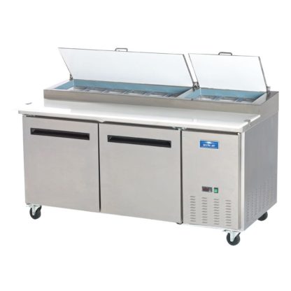 This Arctic Air APP71R 71″ prep refrigerator gives you everything you need to make your restaurant’s signature pizzas, in one convenient place! Use its full length, 17 3/4″ deep cutting board as a place to slice fresh toppings or keep dough during pizza assembly, and for added convenience its top holds up to (9) 1/3 size food pans (included) to keep ingredients handy at all times. The refrigerated cabinet below the prep area gives you a place to store additional toppings and other items, and the self-closing doors come with a stay open feature when opened past 90 degrees.