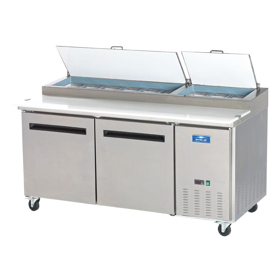 Keep your pizza shop running smoothly with this Artic Air refrigerated prep table. It has nine 1/3 size pans for ingredients and a cutting board for slicing and dicing. There is also 21 cu ft of refrigerated storage for keeping extra ingredients.