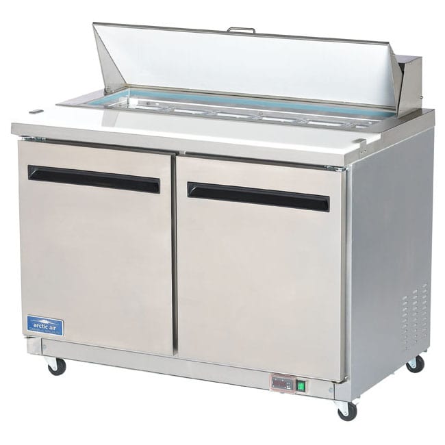 Speed up efficiency on your prep line with this Arctic Air AST48R 48″ prep refrigerator! This unit boasts a full length, 11 1/2″ deep cutting board for slicing up toppings and assembling all your signature sandwiches and salads, and for added convenience, its top holds up to twelve 1/6 size food pans (included) so you can keep your most-used ingredients handy at all times. Below the prep area, a refrigerated cabinet gives you plenty of space to store additional toppings, condiments, and other items, and the self-closing doors come with a stay-open feature when opened past 90 degrees. An electronic thermostat with external digital LED display allows for accurate temperature control.