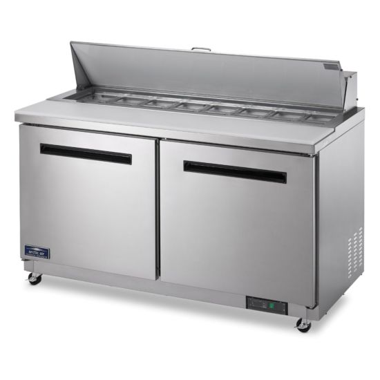 Embrace efficient meal preparation with the Arctic Air AST60R refrigerated sandwich prep table! Designed with 16 included 1/6 size plastic food pans, this unit is perfect for a variety of operations, from cafes to sandwich shops. Store ingredients like peppers and pineapple in the food pans, and use the heavy-duty full length, 11 1/2″ deep cutting board to slice and dice as you assemble tasty dishes. Back up ingredients are easily stored in the lower refrigerated section, which is engineered to maintain interior temperatures between 33 and 41 degrees Fahrenheit. To make storage as easy and organized as possible, the interior houses 2 shelves.